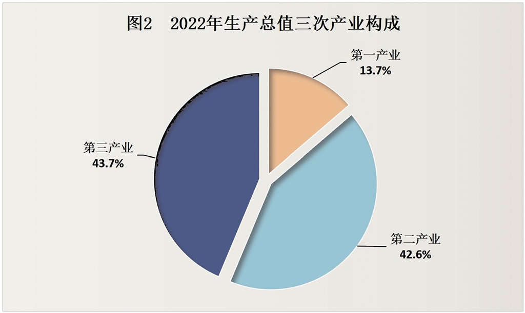 初步核算,全年生產(chǎn)總值1268.65億元,比上年增長2.0%。其中,第一產(chǎn)業(yè)增加值174.56億元,增長4.2%,占生產(chǎn)總值的比重為13.7%;第二產(chǎn)業(yè)增加值540.07億元,增長0.2%,占比42.6%;第三產(chǎn)業(yè)增加值554.02億元,增長2.9%,占比43.7%。人均生產(chǎn)總值51261元,比上年增長2.4%。
