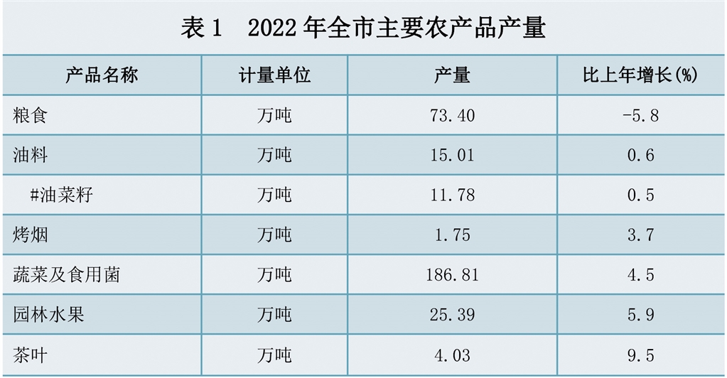 2022年,全市農(nóng)林牧漁業(yè)增加值181.20億元,比上年增長4.3%。其中,農(nóng)業(yè)增加值120.44億元,增長3.7%;林業(yè)增加值4.87億元,增長8.2%;牧業(yè)增加值44.04億元,增長5.0%;漁業(yè)增加值5.20億元,增長3.5%;農(nóng)林牧漁服務(wù)業(yè)增加值6.64億元,增長6.2%。