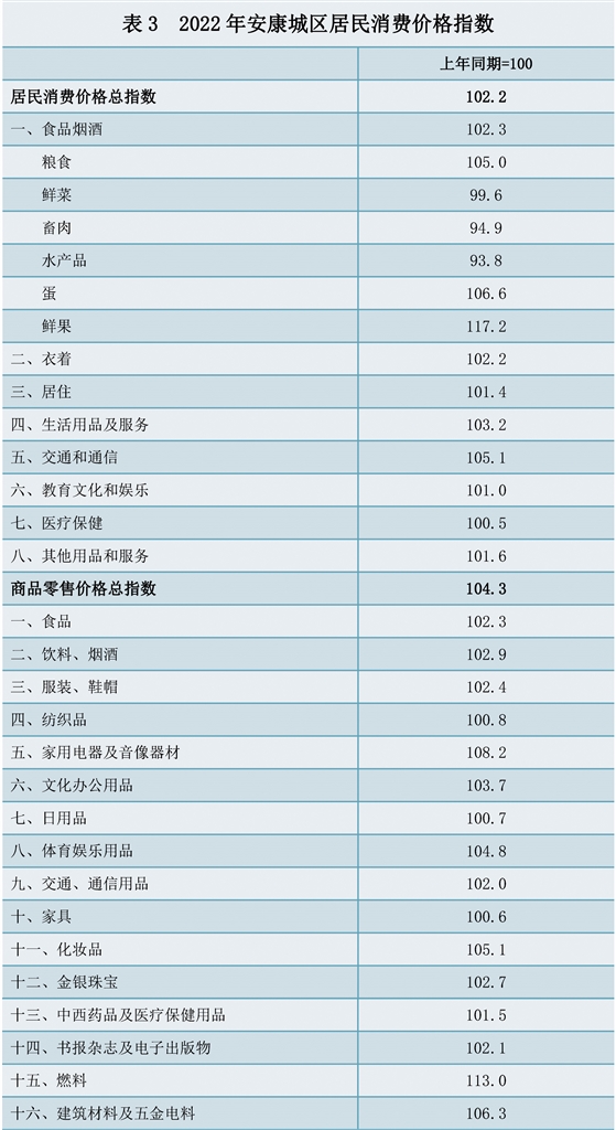 2022年,安康城區(qū)居民消費(fèi)價(jià)格比上年上漲2.2%。商品零售價(jià)格比上年上漲4.3%。