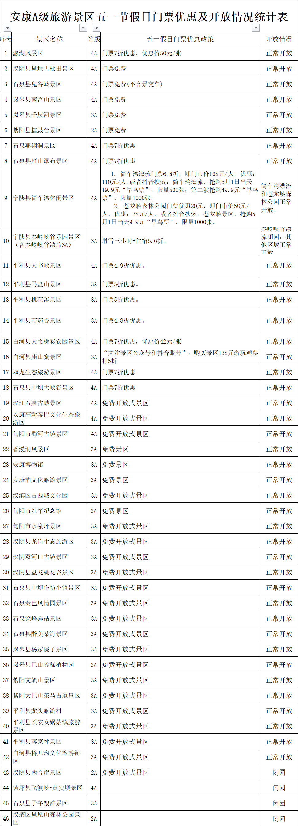 本網(wǎng)訊 2023年五一假期期間,我市有30家景區(qū)免費開放,其中嵐皋縣南宮山景區(qū)、漢陰縣鳳堰古梯田景區(qū)、石泉縣鬼谷嶺景區(qū)(不含景交車)、嵐皋縣千層河景區(qū)、紫陽縣擂鼓臺景區(qū)5家收費景區(qū)免門票。