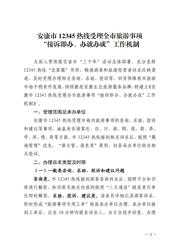 為深入貫徹落實省市“三個年”活動總體部署,充分發(fā)揮12345熱線“總客服”作用,暢通游客和旅游經營者訴求反映渠道,及時受理辦理相關咨詢、求助、投訴等,切實保障我市旅游市場平穩(wěn)有序發(fā)展,持續(xù)擦亮安康生態(tài)旅游服務品牌,特建立《安康市12345熱線受理全市旅游事項“接訴即辦、辦就辦成”工作機制》。