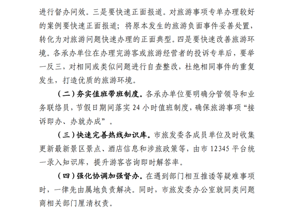 (二)夯實值班帶班制度。各承辦單位要明確分管領導和業(yè)務聯絡員,節(jié)假日期間落實24小時值班制度,確保旅游事項“接訴即辦、辦就辦成”。