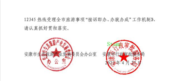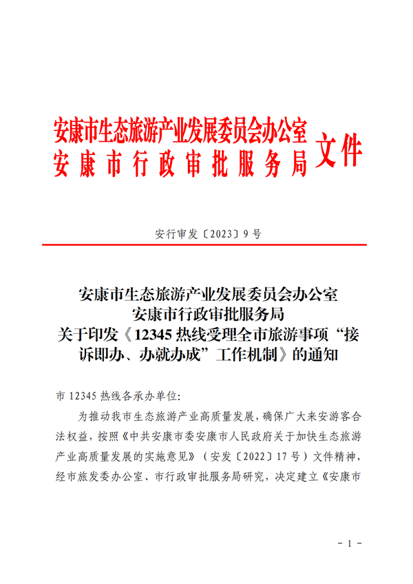 為推動我市生態(tài)旅游產業(yè)高質量發(fā)展,確保廣大來安游客合法權益,按照《中共安康市委安康市人民政府關于加快生態(tài)旅游產業(yè)高質量發(fā)展的實施意見》(安發(fā)〔2022〕17號)文件精神,經市旅發(fā)委辦公室、市行政審批服務局研究,決定建立《安康市12345熱線受理全市旅游事項“接訴即辦、辦就辦成”工作機制》,請認真抓好貫徹落實。