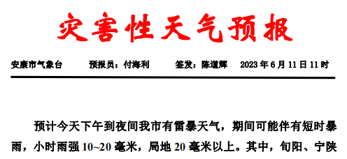 6月11日11時,安康市氣象臺發(fā)布災害性天氣預報:nwN安康新聞網(wǎng)