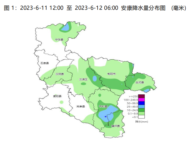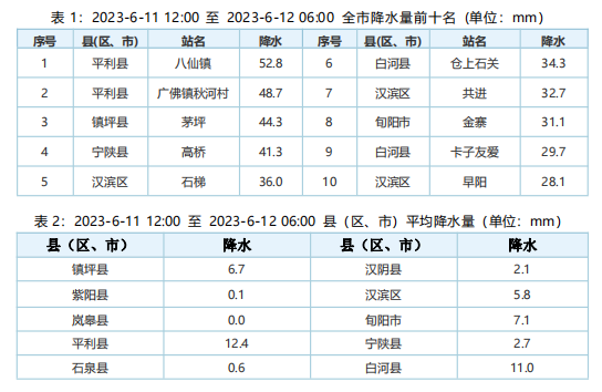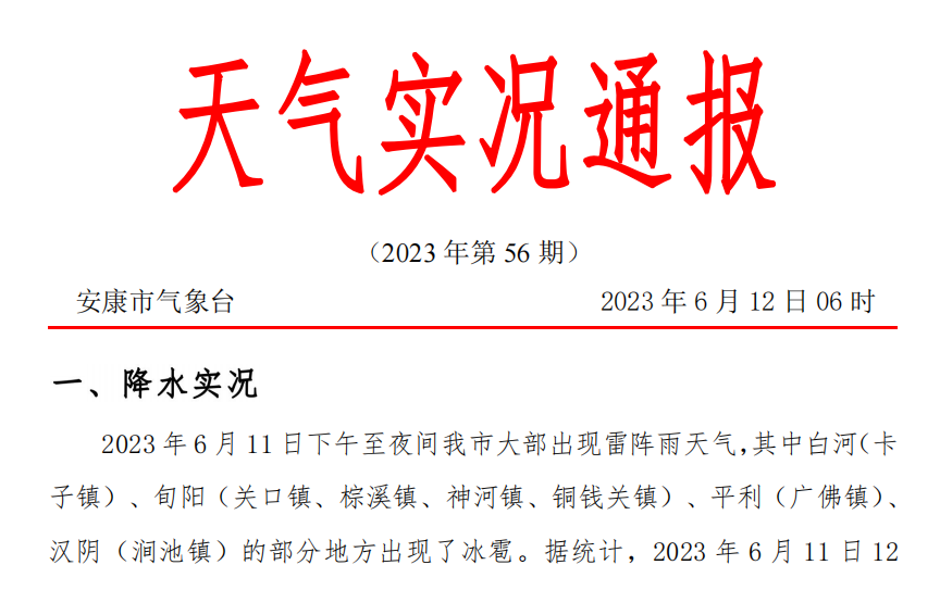 2023年6月11日下午至夜間我市大部出現(xiàn)雷陣雨天氣,其中,白河(卡子鎮(zhèn))、旬陽(yáng)(關(guān)口鎮(zhèn)、棕溪鎮(zhèn)、神河鎮(zhèn)、銅錢(qián)關(guān)鎮(zhèn))、平利(廣佛鎮(zhèn))、漢陰(澗池鎮(zhèn))的部分地方出現(xiàn)了冰雹。據(jù)統(tǒng)計(jì),2023年6月11日12時(shí)至6月12日06時(shí)安康市平均雨量為4.6毫米,其中單站雨量最大為平利八仙氣象監(jiān)測(cè)站52.8毫米,縣市平均雨量最大為平利縣12.4毫米,最大小時(shí)雨強(qiáng)出現(xiàn)在平利廣佛鎮(zhèn)秋河村氣象監(jiān)測(cè)站43.4毫米(6月11日17時(shí)至18時(shí)),共有154個(gè)氣象監(jiān)測(cè)站出現(xiàn)了降雨(大于0.1毫米),10毫米以上有50站,25毫米以上有14站,50毫米以上有1站。安康氣象監(jiān)測(cè)站4.3毫米。