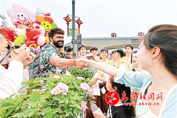 6月22日,來自印度的游客Ramm在觀看完龍舟節(jié)開幕式后與演職人員合影。記者 潘潤生 攝