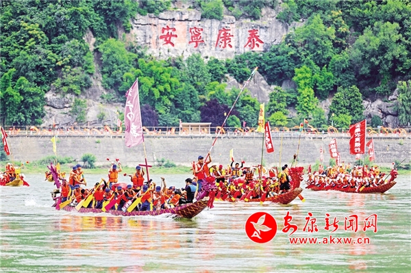 6月22日,第二十三屆中國安康漢江龍舟節(jié)開幕,28支參賽隊(duì)伍在漢江上表演龍舟競渡,喜迎端午佳節(jié)。 張昊 攝