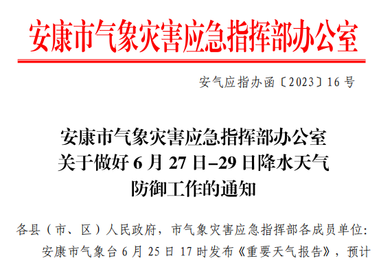 6月25日,安康市氣象災害應急指揮部辦公室發(fā)布《關于做好6月27日—29日降水天氣防御工作的通知》。