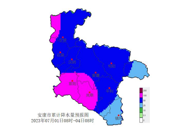 7月2日:中到大雨(20-40毫米),其中紫陽大部、漢陰南部、漢濱西南部、嵐皋西部的部分鎮(zhèn)辦大到暴雨(30-50毫米);