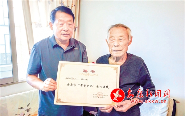 安康市書香少兒讀書會負責(zé)人李煥龍為鄺民三送上“愛心大使”聘書。