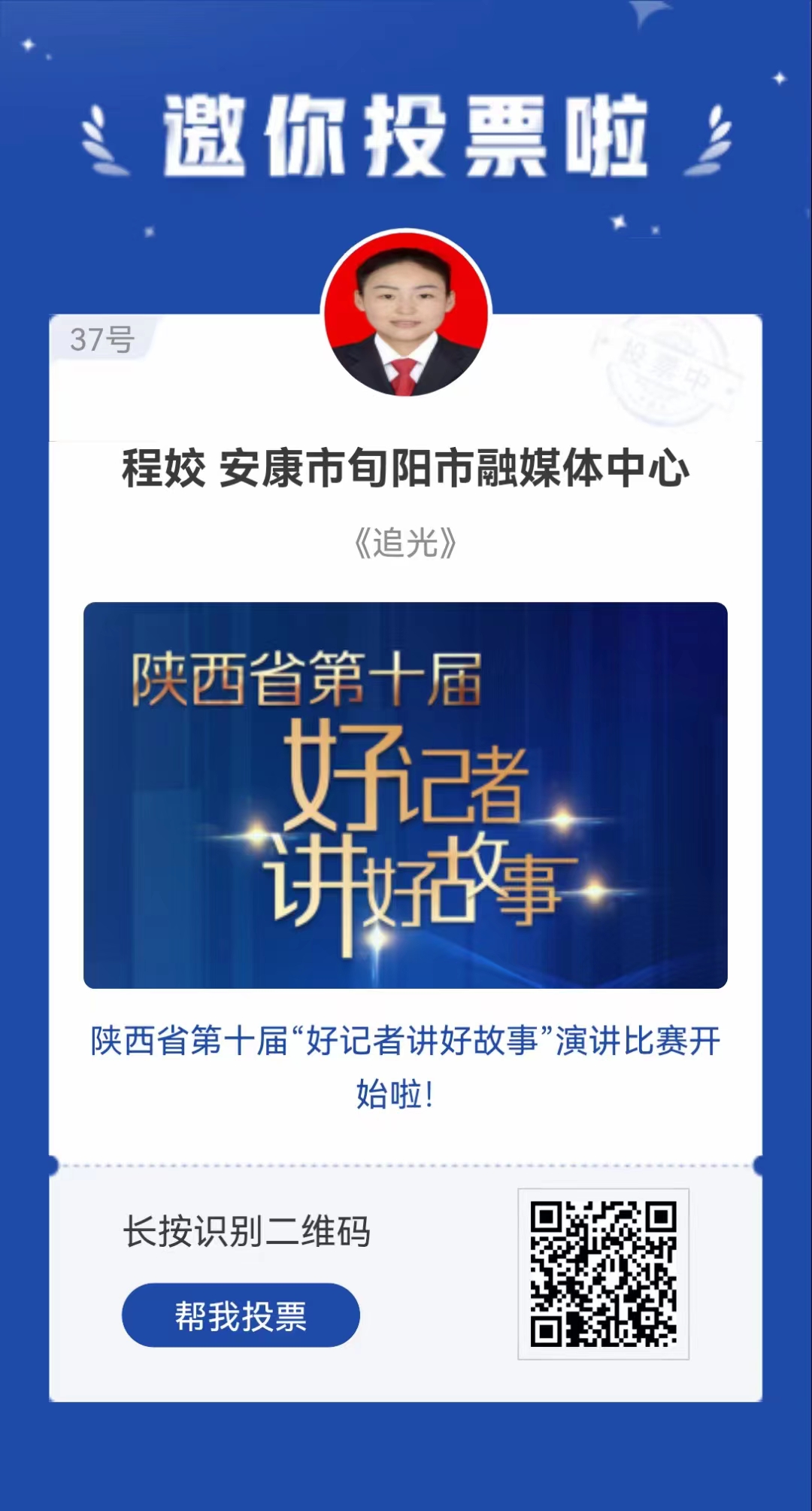 陜西省第十屆“好記者講好故事”活動(dòng)決賽開幕在即。7月26日,陜西省新聞工作者協(xié)會(huì)開通投票通道,由我市推薦的旬陽(yáng)市融媒體中心程姣(故事作品《追光》)順利入圍。
