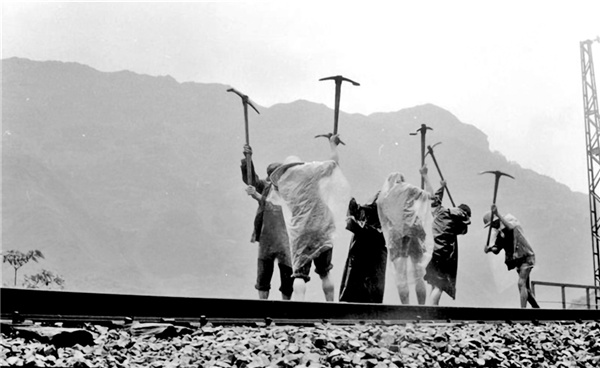 這里在大巴山深處,找不到三尺平地,無法安置站臺(tái),鐵道兵就把站臺(tái)修在橋面上。車站值班室是間磚房,一張桌子,兩張椅子,兩個(gè)值班員,一正一副。充當(dāng)站臺(tái)的橋面上鋪了三股鋼軌,一股供臨時(shí)停車用,另兩股通往山外。站臺(tái)對(duì)面是山,筆陡如削,巖石如鐵,透溢著拒人千里的冷色。