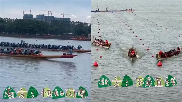 前不久的端午節(jié),關(guān)于南北方人龍舟賽的對(duì)比視頻被拉出來(lái)玩壞了。視頻中的北方龍舟代表隊(duì)看起來(lái)姿勢(shì)笨拙,頻頻翻船,網(wǎng)友調(diào)侃:紀(jì)念屈原主打一個(gè)“下水陪伴”;而畫(huà)面中的南方龍舟代表隊(duì)把龍舟玩出了花,S彎漂移、彈射起步信手拈來(lái),主打一個(gè)同舟共濟(jì)。