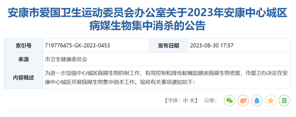 8月30日,安康市愛國衛(wèi)生運動委員會辦公室發(fā)布《關(guān)于2023年安康中心城區(qū)病媒生物集中消殺的公告》,具體如下。