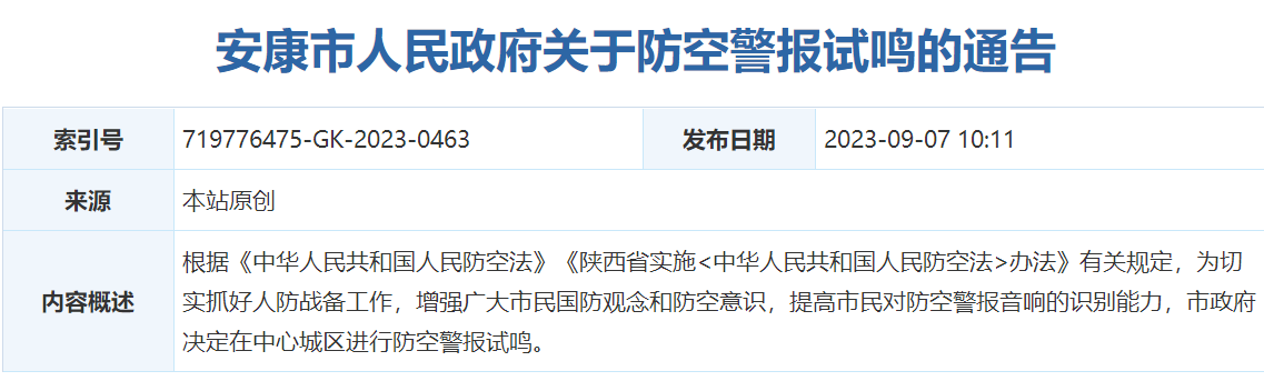 安康市人民政府關(guān)于防空警報(bào)試?guó)Q的通告