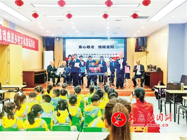 白河縣獅子山社區(qū)聯(lián)合城關(guān)鎮(zhèn)中心幼兒園舉辦“童心敬老情暖重陽”主題活動(dòng)。黃秀琴 攝