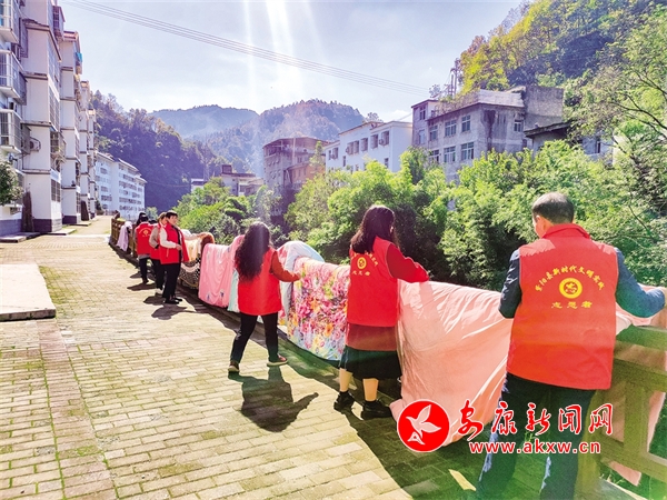 紫陽縣高橋鎮(zhèn)桂花樹社區(qū)組織新時(shí)代文明實(shí)踐志愿者服務(wù)隊(duì),幫助社區(qū)行動(dòng)不便的獨(dú)居老人、殘疾人曬被子、裝過冬棉被。胡波 王順勤 攝