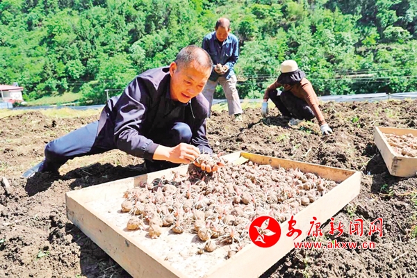 藺河鎮(zhèn)蔣家關(guān)村產(chǎn)業(yè)大戶(hù)、立新魔芋農(nóng)民專(zhuān)業(yè)合作社負(fù)責(zé)人的王永成,挑選基地培育適應(yīng)當(dāng)?shù)卦苑N高產(chǎn)魔芋種子下田。