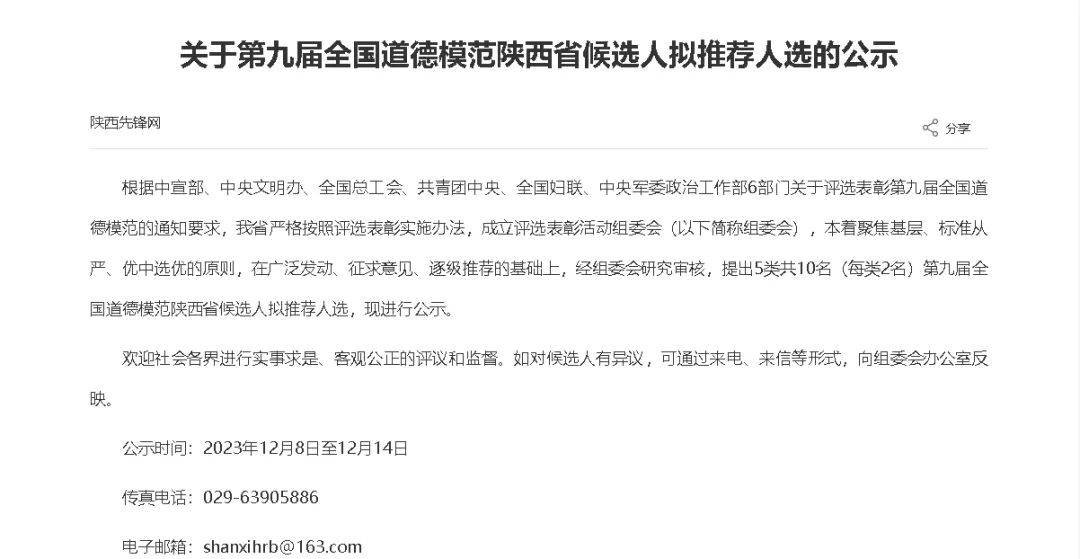 根據(jù)中宣部、中央文明辦、全國(guó)總工會(huì)、共青團(tuán)中央、全國(guó)婦聯(lián)、中央軍委政治工作部6部門關(guān)于評(píng)選表彰第九屆全國(guó)道德模范的通知要求,我省嚴(yán)格按照評(píng)選表彰實(shí)施辦法,成立評(píng)選表彰活動(dòng)組委會(huì)(以下簡(jiǎn)稱組委會(huì)),本著聚焦基層、標(biāo)準(zhǔn)從嚴(yán)、優(yōu)中選優(yōu)的原則,在廣泛發(fā)動(dòng)、征求意見、逐級(jí)推薦的基礎(chǔ)上,經(jīng)組委會(huì)研究審核,提出5類共10名(每類2名)第九屆全國(guó)道德模范陜西省候選人擬推薦人選,現(xiàn)進(jìn)行公示。