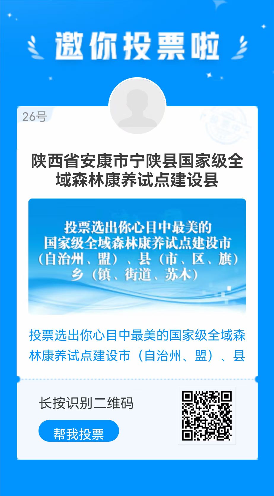 據(jù)了解,國家級森林康養(yǎng)試點建設單位認定工作由中國林業(yè)產(chǎn)業(yè)聯(lián)合會負責開展,經(jīng)自愿申報、主管部門審核推薦、合規(guī)用地和安全經(jīng)營專項檢查、當?shù)毓尽<覍彶榧罢J定結果全國公示等程序,確定了2023年國家級森林康養(yǎng)試點建設單位名單。同時還開設投票活動,選出大眾心目中最美的國家級森林康養(yǎng)試點建設基地和中國森林康養(yǎng)人家,請為森林履蓋率全國第一的“秦嶺之心 綠都寧陜”投上您寶貴的3票。ㄩL按二維碼即可投票,每個微信號每天可投3票)