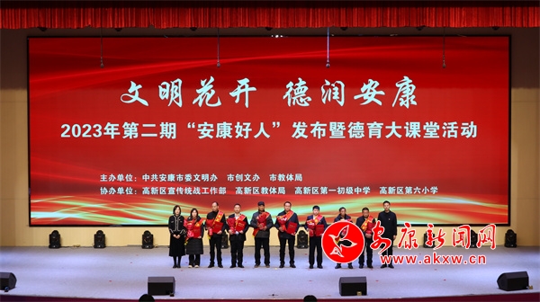 本次活動以“文明花開 德潤安康”為主題,共有33人(組)“安康好人”上榜;顒庸卜譃橹藶闃贰⒁娏x勇為、誠實守信、孝老愛親、敬業(yè)奉獻五個篇章,通過事跡短片展播、現(xiàn)場訪談、宣讀致敬詞、表演文藝節(jié)目等方式,生動展現(xiàn)了“安康好人”的感人故事和善行義舉,深刻詮釋了中華民族的道德內(nèi)涵和精神傳承,為現(xiàn)場學生帶來了一場生動形象的德育大課堂,F(xiàn)場還向“安康好人”贈送了道德禮遇大禮包。