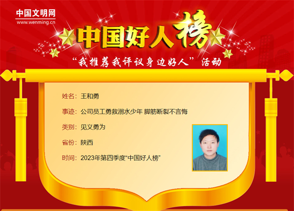 王和勇,男,1987年8月生,陜西省水務公司職工。在少年溺水的危機時刻,王和勇忘記自己“準爸爸”的身份,毫不猶豫跳進水流湍急的河里奮勇施救。王和勇曾獲“陜西好人”榮譽。