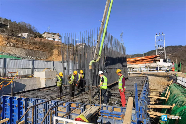 “對(duì)施工現(xiàn)場(chǎng)承臺(tái)尺寸測(cè)量和檢查,確保承臺(tái)的尺寸和位置準(zhǔn)確無誤。隨后按照設(shè)計(jì)圖紙及規(guī)范要求綁扎承臺(tái)鋼筋,布設(shè)降溫管,埋設(shè)墩身預(yù)埋鋼筋,定型鋼模板安裝加固,以確保承臺(tái)的強(qiáng)度和穩(wěn)定性。”現(xiàn)場(chǎng)技術(shù)員高敬智說道。施工中,參建單位嚴(yán)格落實(shí)安全質(zhì)量技術(shù)交底,優(yōu)化施工配置,項(xiàng)目技術(shù)人員全程盯控,按標(biāo)準(zhǔn)化施工要求分層澆筑、振搗、下料,確保混凝土澆筑順利進(jìn)行。