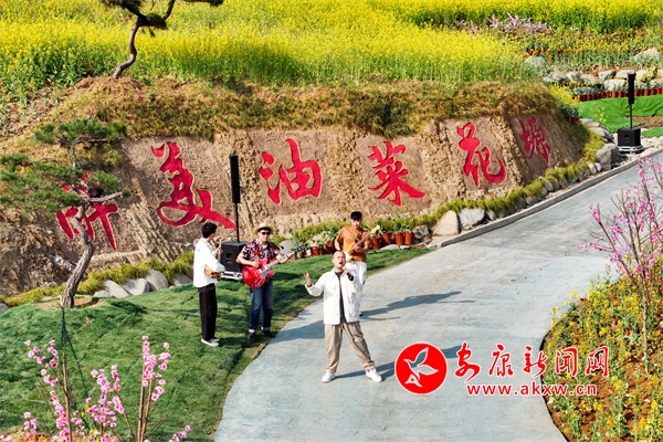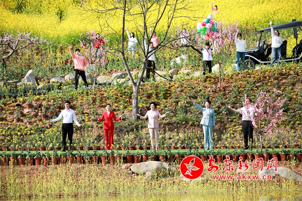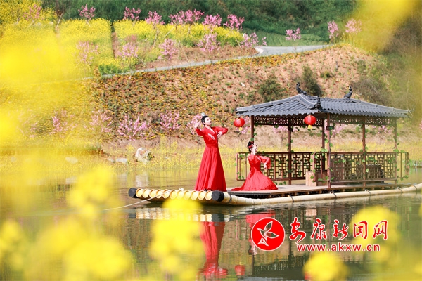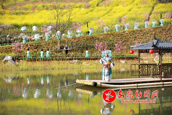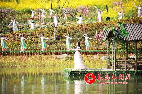 春日的水田溝村生機(jī)勃發(fā),漫山的油菜花在暖陽下爭相怒放,山坡下是一汪清澈的湖水;顒右郎骄蛣、水陸并用,將演員、舞臺、道具與水田溝村地形地貌完美融合,營造出“人在畫中游,畫在景中走”的和美景象。隨著原創(chuàng)歌曲《水田溝的油菜花》悠揚(yáng)動聽的歌聲從湖面的小船傳來,活動正式拉開帷幕,獨唱《問春》、情景詩朗誦《母親河》、歌伴舞《醉美桃花源》、情景劇《桃花源記》、漢劇歌舞《喬木花》、原創(chuàng)歌曲《阿依娜》、歌伴舞《幸福安康》等精彩節(jié)目相繼上演,悠揚(yáng)的歌聲、曼妙的舞姿在湖上、在油菜花田、在蜿蜒的山路漸次呈現(xiàn),將現(xiàn)場觀眾和游客迅速帶入安康桃花源美麗夢幻的油菜花海世界,沉浸式感受安康高新區(qū)產(chǎn)城綠融合發(fā)展和鄉(xiāng)村振興的顯著成效。