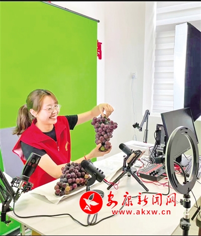 “大家好!歡迎來到山地生態(tài)葡萄直播間,今天給大家?guī)淼氖俏覀冞@兒的招牌水果陽光玫瑰葡萄。”在構(gòu)元社區(qū)的專屬直播間里,志愿者正在進行一場直播帶貨。