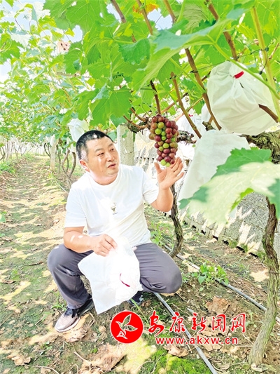 2016年,吳世銀開始嘗試在本地小范圍種植葡萄,2019年10月,在該鎮(zhèn)大力支持下開始發(fā)展山地葡萄種植,并成立家庭農(nóng)場。經(jīng)過8年持續(xù)發(fā)展,他的基地從最開始只有一個夏黑品種發(fā)展至現(xiàn)在5個品種,目前種植規(guī)模40余畝,年產(chǎn)值達(dá)60萬元。