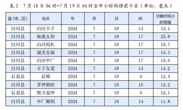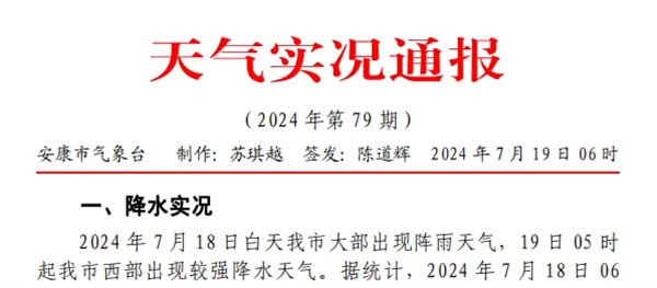 2024年7月18日白天我市大部出現(xiàn)陣雨天氣,19日05時起我市西部出現(xiàn)較強降水天氣。據(jù)統(tǒng)計,2024年7月18日06時至7月19日06時安康市平均雨量為6.1毫米,其中單站雨量最大為白河卡子氣象監(jiān)測站48.4毫米,縣市平均雨量最大為白河縣15.3毫米,最大小時雨強出現(xiàn)在白河卡子氣象監(jiān)測站33.1毫米(18日13時-14時)。全市共有235個站出現(xiàn)了降雨(大于0.1毫米),10毫米(中雨)以上有41站,25毫米(大雨)以上有8站。共有16站次小時雨強超過10毫米,2站次小時雨強超過20毫米。