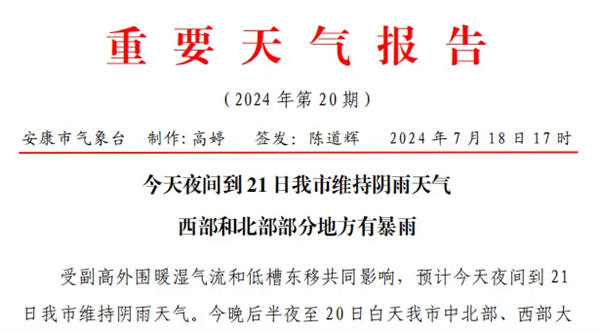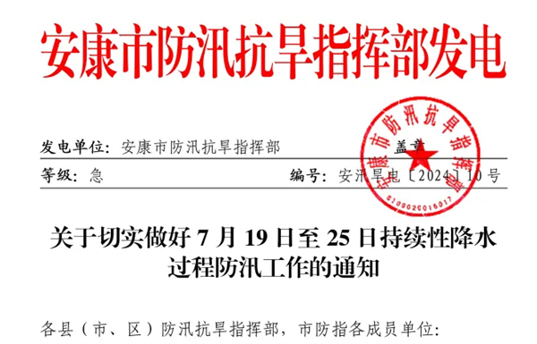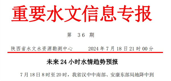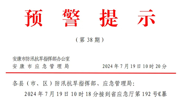 2024年7月19日10時18分接到省應急廳第192號《暴雨橙色預警》:預計未來3小時我市漢濱區(qū)、寧陜縣降雨量將達50 毫米以上,未來6小時我市漢陰縣、石泉縣、旬陽市、白河縣將達50毫米以上,以上地區(qū)境內(nèi)發(fā)生山洪、泥石流等災害風險較高。