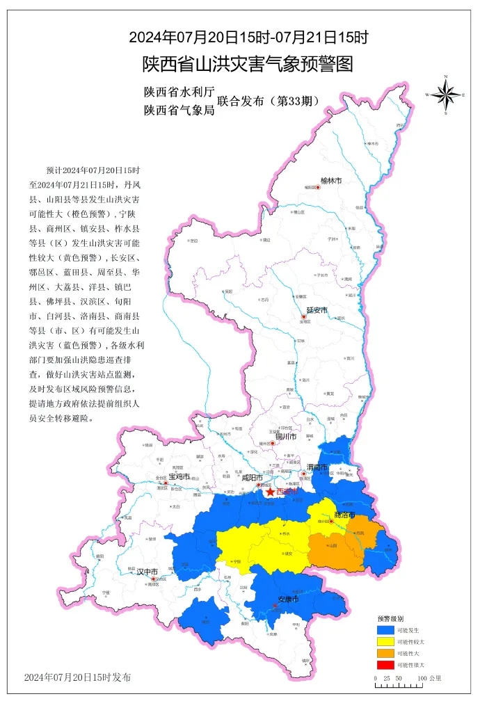 陜西省水利廳與省氣象局聯(lián)合發(fā)布山洪災(zāi)害預(yù)警,預(yù)計(jì)7月20日15時(shí)至7月21日15時(shí),下圖中所示縣(區(qū))可能發(fā)生山洪災(zāi)害預(yù)警:其中我市寧陜縣發(fā)生山洪災(zāi)害可能性較大(黃色預(yù)警),漢濱區(qū)、旬陽(yáng)市、白河縣有可能發(fā)生山洪災(zāi)害(藍(lán)色預(yù)警),各級(jí)水利部門要加強(qiáng)山洪隱患巡查排查,做好山洪災(zāi)害站點(diǎn)監(jiān)測(cè),及時(shí)發(fā)布區(qū)域風(fēng)險(xiǎn)預(yù)警信息,地方政府應(yīng)依法提前組織人員安全轉(zhuǎn)移避險(xiǎn)。