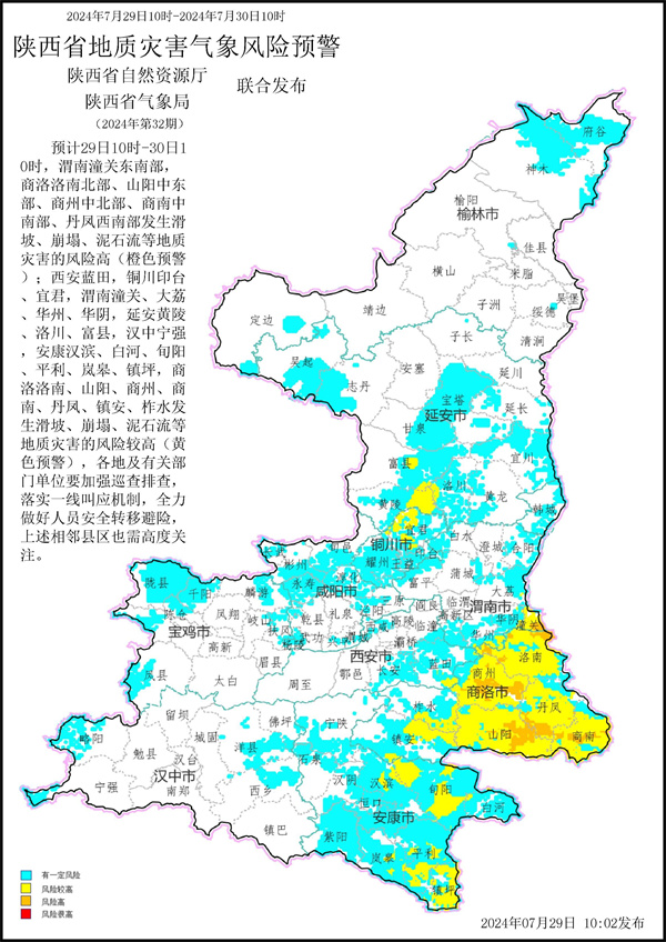 陜西省自然資源廳與陜西省氣象局聯(lián)合發(fā)布地質(zhì)災(zāi)害氣象風(fēng)險預(yù)警:7月29日10時至7月30日10時,下圖所示縣(區(qū))可能發(fā)生地質(zhì)災(zāi)害:其中我市漢濱、白河、旬陽、平利、嵐皋、鎮(zhèn)坪發(fā)生滑坡、崩塌、泥石流等地質(zhì)災(zāi)害的風(fēng)險較高(黃色預(yù)警),各地及有關(guān)部門單位要加強巡查排查,落實一線叫應(yīng)機制,全力做好人員安全轉(zhuǎn)移避險,上述相鄰縣區(qū)也需高度關(guān)注。