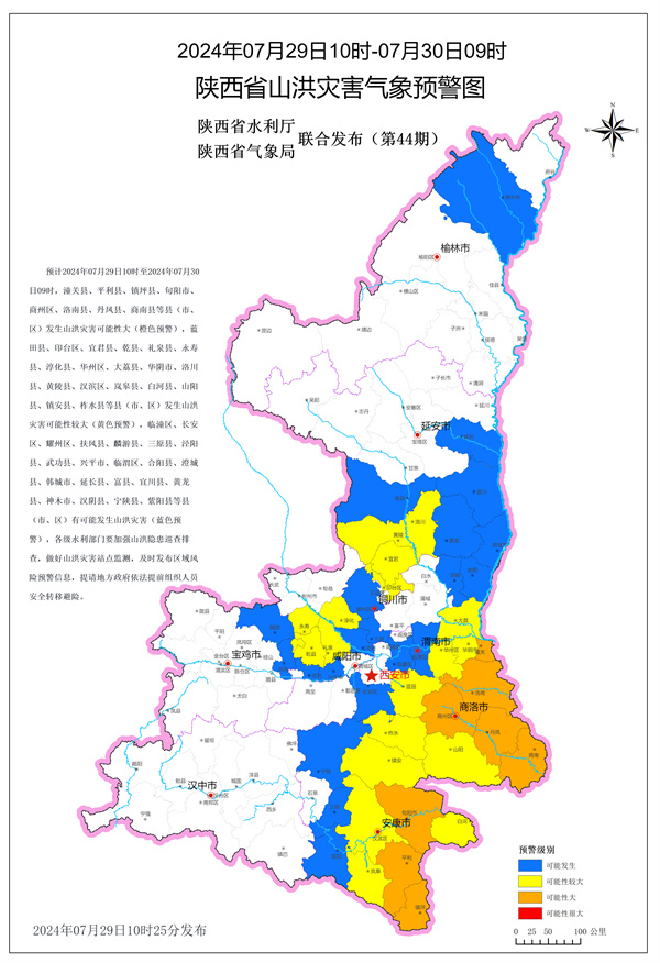 陜西省水利廳與陜西省氣象局聯(lián)合發(fā)布山洪災(zāi)害氣象預(yù)警:預(yù)計7月29日10時至7月30日9時,下圖中所示縣(區(qū))可能發(fā)生山洪災(zāi)害,其中我市漢濱區(qū)、嵐皋縣、白河縣發(fā)生山洪災(zāi)害可能性較大(黃色預(yù)警),漢陰縣、寧陜縣、紫陽縣有可能發(fā)生山洪災(zāi)害(藍色預(yù)警),各級水利部門要加強山洪隱患巡查排查,做好山洪災(zāi)害站點監(jiān)測,及時發(fā)布區(qū)域風(fēng)險預(yù)警信息,地方政府應(yīng)依法提前組織人員安全轉(zhuǎn)移避險。