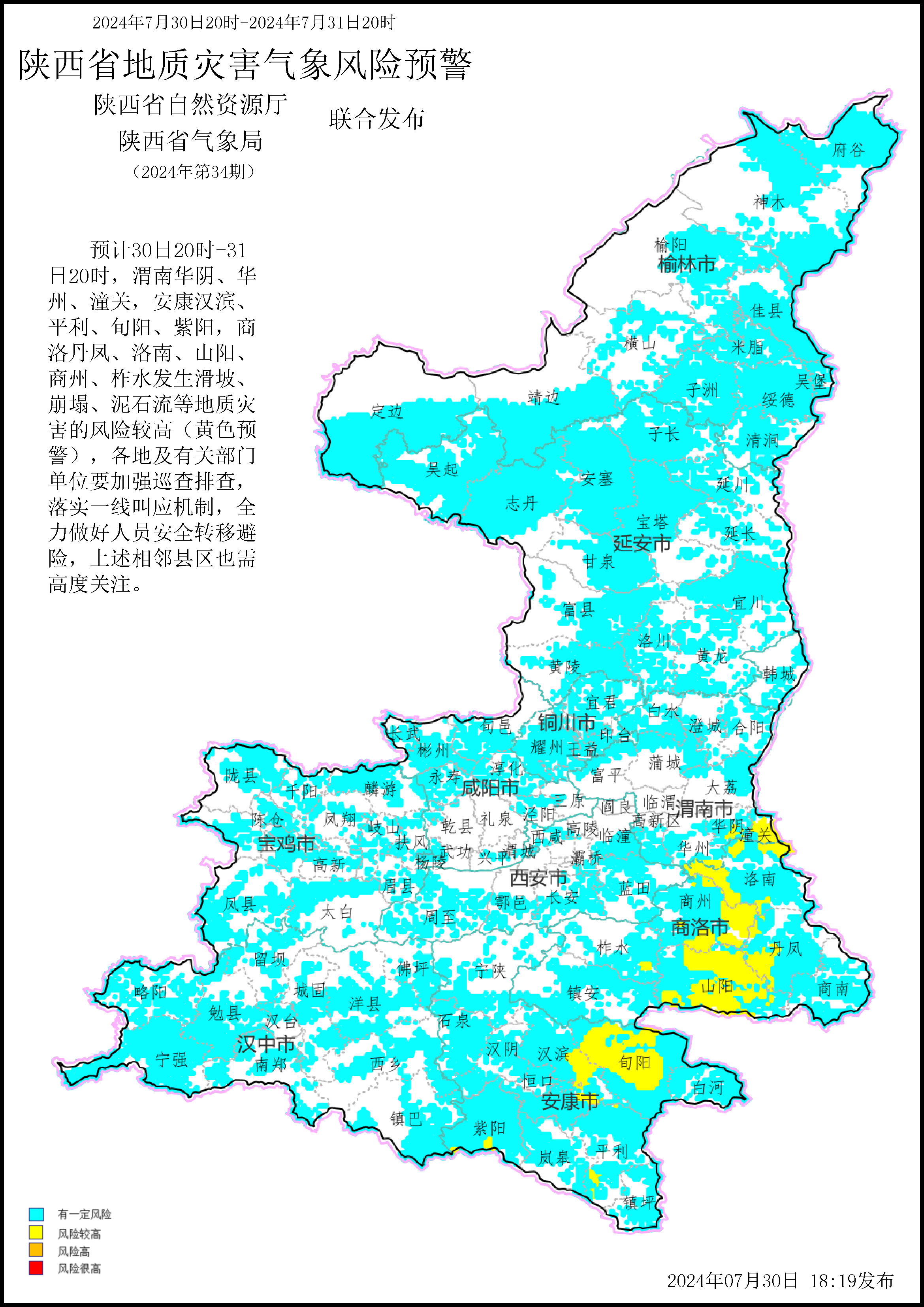 陜西省自然資源廳與陜西省氣象局聯(lián)合發(fā)布地質(zhì)災(zāi)害氣象風險預(yù)警:預(yù)計2024年7月30日20時—31日20時,渭南華陰、華州、潼關(guān),安康漢濱、平利、旬陽、紫陽,商洛丹鳳、洛南、山陽、商州、柞水發(fā)生滑坡、崩塌、泥石流等地質(zhì)災(zāi)害的風險較高(黃色預(yù)警),各地及有關(guān)部門單位要加強巡查排查,落實一線叫應(yīng)機制,全力做好人員安全轉(zhuǎn)移避險,上述相鄰縣區(qū)也需高度關(guān)注。