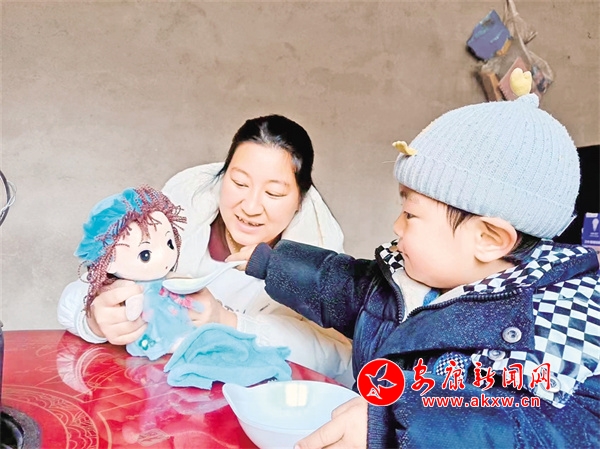 在城關(guān)鎮(zhèn)城北養(yǎng)育中心的教室內(nèi),養(yǎng)育師正在給孩子和家長進行一對一的課程輔導。“這是訓練寶寶生活習慣的,根據(jù)寶寶吃飯的步驟,通過游戲的方式來慢慢地讓他養(yǎng)成良好的生活習慣……”