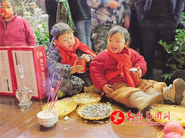小朋友系上紅綢子祈福保平安。