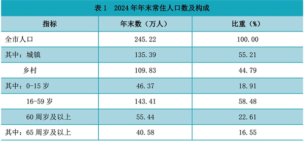 2024年末,全市常住人口245.22萬人,比上年末減少0.5萬人。其中,城鎮(zhèn)人口135.39萬人,城鎮(zhèn)化率達(dá)到55.21%;鄉(xiāng)村人口109.83萬人,占44.79%。出生人口1.69萬人,出生率為6.89‰;死亡人口2.02萬人,死亡率為8.24‰;自然增長率為-1.35‰。