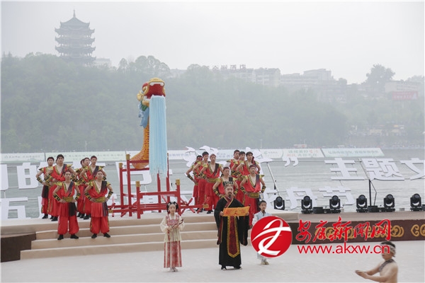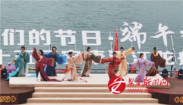 活動現(xiàn)場,6聲渾厚鐘聲劃破長空。“緬懷先賢……”隨著主祭官畫外音傳來,60名身著青綠漢服的女子手捧香粽菖蒲,踏古琴清音翩躚而出。屈原塑像被緩緩護送入舞臺中央,112名身著漢服的學童齊聲詠頌祭文的聲浪在江岸回蕩。隨著粽拋碧波,香囊、梔子花贈客,流淌千年的龍舟文化,化作平安順利、幸福安康的當代回響。