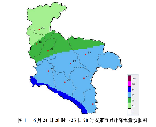 6月25日白天至夜間:西北部小到中雨(0~10毫米),中南部大雨(20~40毫米),南部巴山沿線局地暴雨(50毫米以上);