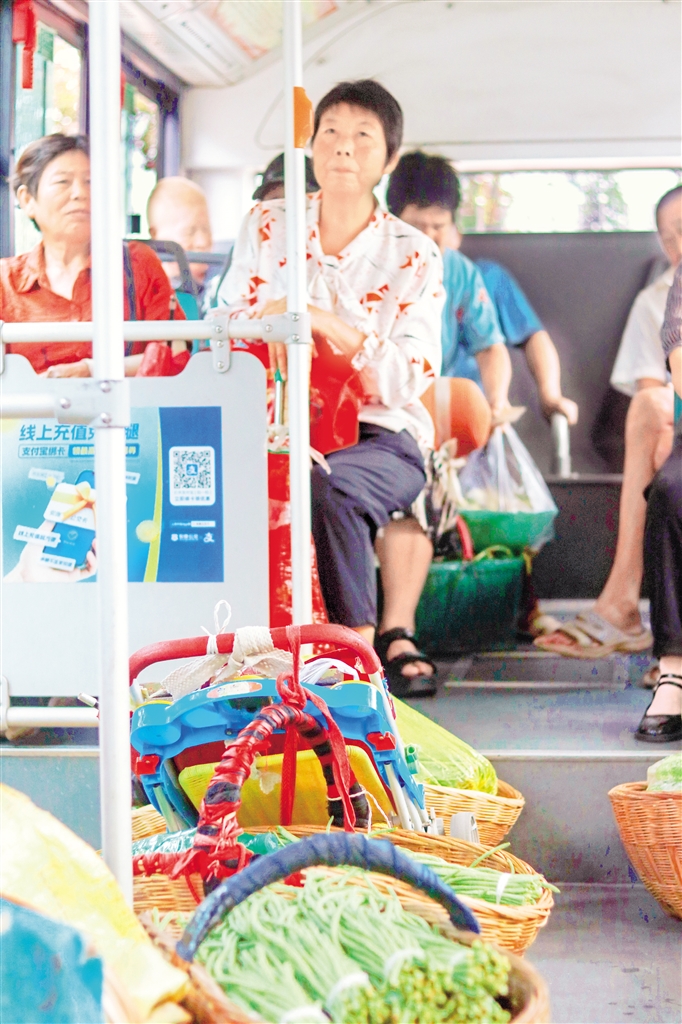 記者在途中看到,狹小的車廂內(nèi),滿是帶著露珠的新鮮蔬菜,還有公交駕駛員不厭其煩的服務(wù)態(tài)度。菜農(nóng)緊挨著自己的竹筐坐在車內(nèi),迎著漫天霞光,將大包小包的蔬菜送向城市餐桌,這是他們的日常,唯一不同的是有了接他們進(jìn)城的“專車”。