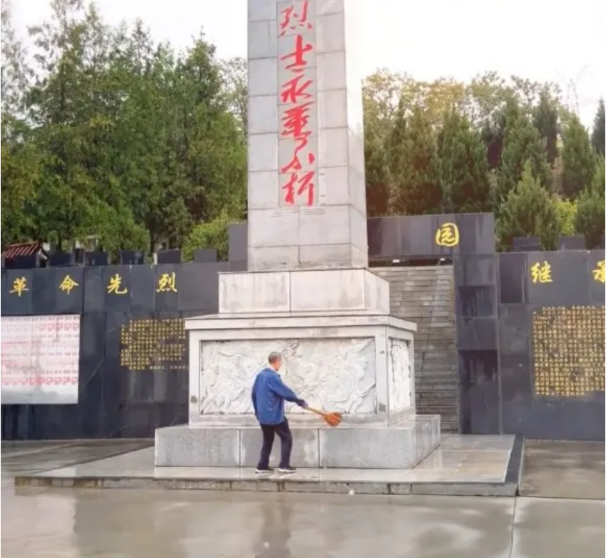 9月5日,守陵人王開茂在烈士陵園擦拭紀(jì)念碑。(圖片來源:嵐皋縣融媒中心)