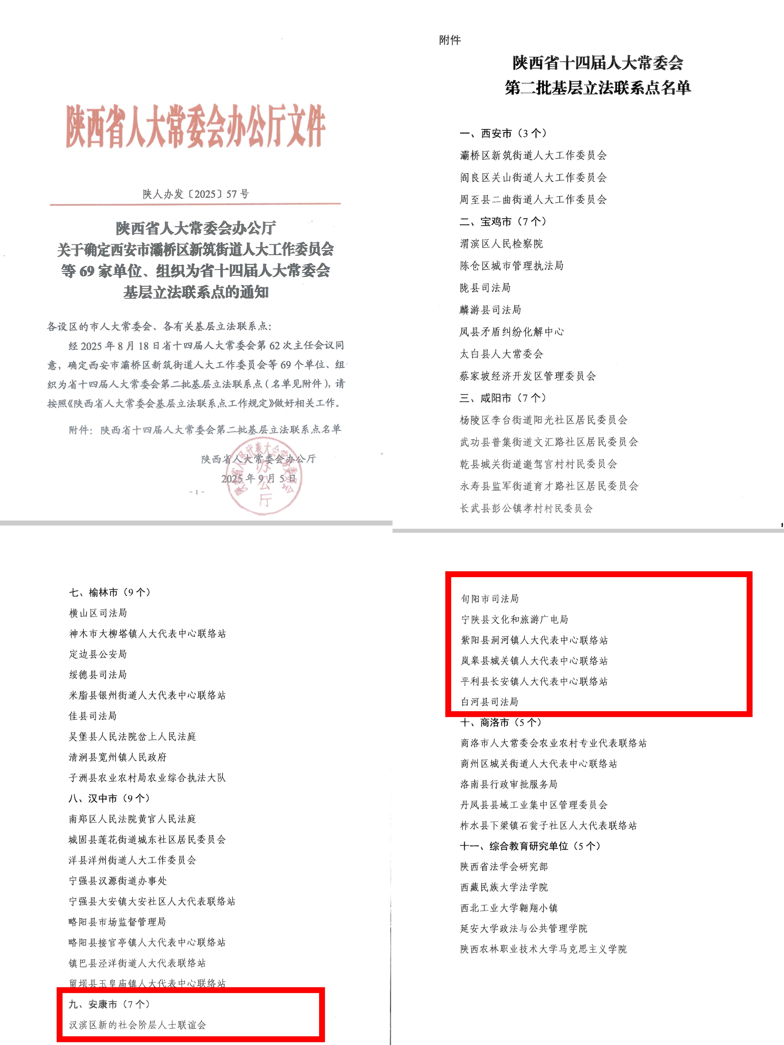 本網訊(通訊員 段文貞)9月5日,省人大常委會公布《陜西省十四屆人大常委會第二批基層立法聯(lián)系點名單》,我市漢濱區(qū)新的社會階層人士聯(lián)誼會、旬陽市司法局、寧陜縣文化和旅游廣電局、紫陽縣洞河鎮(zhèn)人大代表中心聯(lián)絡站、嵐皋縣城關鎮(zhèn)人大代表中心聯(lián)絡站、平利縣長安鎮(zhèn)人大代表中心聯(lián)絡站、白河縣司法局7家單位、組織成功入選。這是繼2023年省人大常委會在我市確立首批4個基層立法聯(lián)系點以來,通過綜合考核、嚴格篩選再次確立的7個基層立法聯(lián)系點,實現(xiàn)了全市各縣(市、區(qū))全覆蓋。