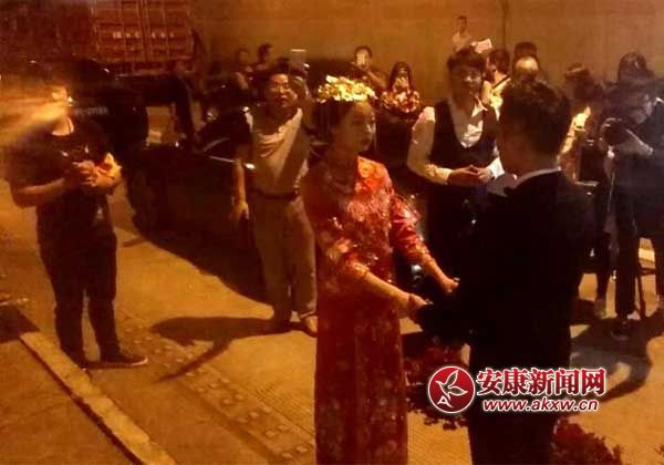 在司儀主持下,新郎從婚車上將新娘接下。兩人在四五十位親朋以及受邀作為嘉賓的過(guò)往司機(jī)祝福和掌聲中,緊緊地?fù)肀г谝黄稹?2時(shí)10分,經(jīng)過(guò)緊張疏通,救援人員清理出一個(gè)車道單邊放行,這對(duì)新人成功趕到位于安康市高新區(qū)的酒店成功舉辦了婚禮。