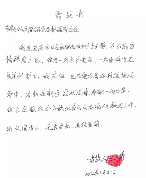 “在當(dāng)前疫情肆虐之際,作為一名共產(chǎn)黨員,一名進(jìn)修重癥醫(yī)學(xué)的護(hù)士,我應(yīng)該,也有能力參加到這場戰(zhàn)爭中,為抗擊新型冠狀病毒貢獻(xiàn)一份力量,我自愿報名加入武漢疫區(qū)及本院的救治工作,聽從安排,無畏生死,勇往直前!”請戰(zhàn)書中的一字一句,都表達(dá)著王靜馳援武漢的堅定決心,都沉淀著一個共產(chǎn)黨員的初心使命。雖為人妻、為人母,為人女,但是當(dāng)疫情來臨,王靜義無反顧主動請纓,化身最美逆行者。