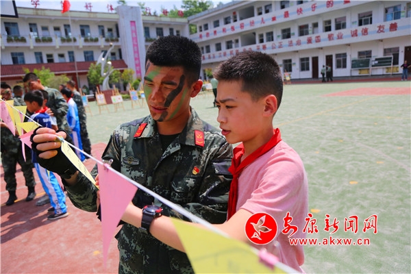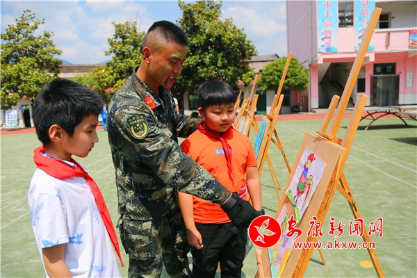 “實現(xiàn)中華民族偉大復(fù)興的中國夢將要在你們手中實現(xiàn),你們是未來的主力軍、生力軍,你們一定要好好學(xué)習(xí),天天向上。”支隊某部指導(dǎo)員鮮研正為孩子們開展國防教育,點燃了孩子們心中埋藏許久的愛國心、國防情。