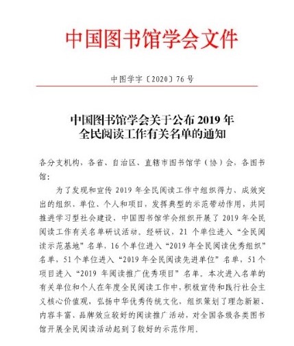 本網(wǎng)訊(通訊員 周啟立 王庭德)中國(guó)圖書館學(xué)會(huì)日前公布了2019年度“全民閱讀工作有關(guān)名單”評(píng)選結(jié)果,安康市圖書館榮獲“全民閱讀優(yōu)秀組織”稱號(hào)。