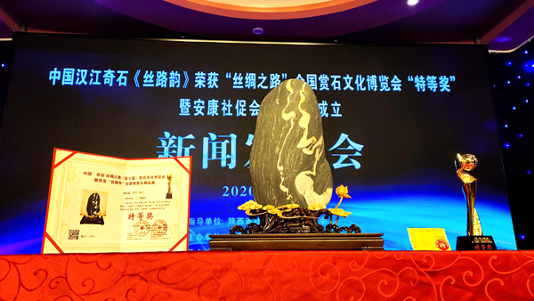 新聞發(fā)布會上,中國觀賞石鑒評師、漢江流域漢江石專家組成員王鐵石同志介紹漢江奇石《絲路韻》獲獎情況。安康市政協(xié)原副主席李啟良、黃秀玲上臺為安康社促會奇石協(xié)會成立揭牌。安康市社促會奇石協(xié)會向石泉縣金蠶小鎮(zhèn)鎏金銅蠶博物館贈送了漢江奇石《蠶寶寶》。