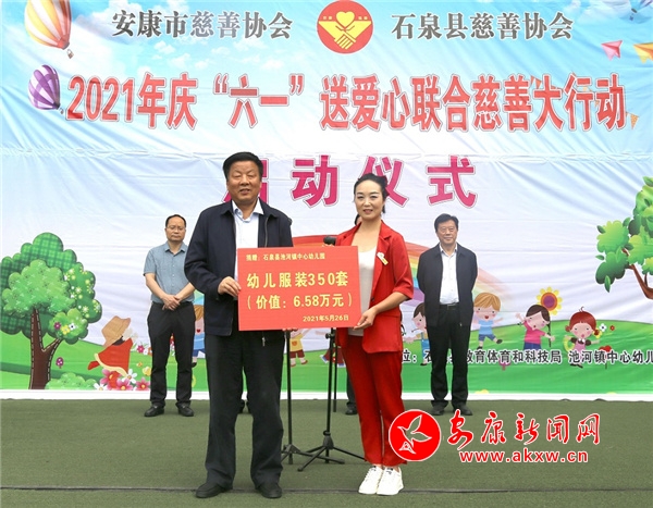 本網(wǎng)訊(通訊員 張蕾)5月26日,安康市慈善協(xié)會(huì)2021年慶“六一”向困難兒童送愛心慈善聯(lián)合大行動(dòng)在石泉縣池河鎮(zhèn)中心幼兒園正式啟動(dòng)。此次活動(dòng)主題為“童心筑夢(mèng)•愛暖明天”,旨在用大愛溫暖孩子們的心,讓他們感受到社會(huì)各界的關(guān)愛,在愛的呵護(hù)下健康快樂成長(zhǎng)。